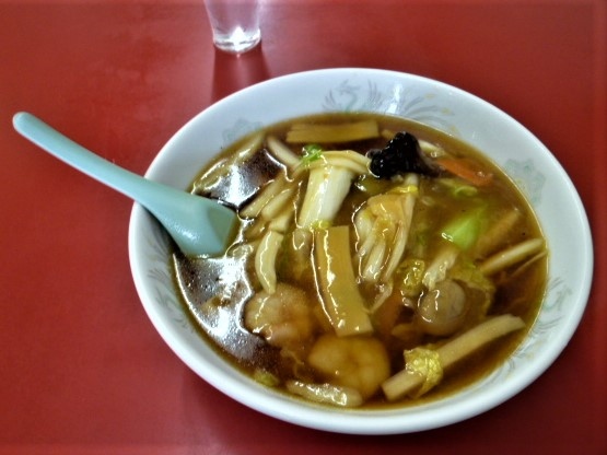 五目ラーメン(イカ・エビ)を頼みました…沢山の具;イカ・エビ/筍・ネギ・キクラゲ,,と細い麺が山盛りでお腹いっぱいに食しました、満足(^^)