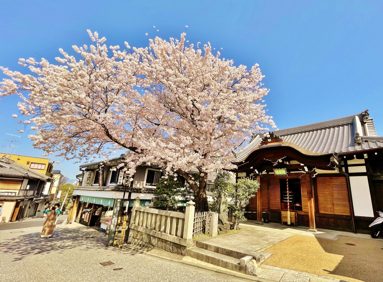 清水坂と三年坂が交わるところにある清水寺の塔頭で、正式には来迎院といいます。ご本尊は聖徳太子自らが刻んだと云う秘伝の仏像を祀っています。桜のお花見で清水寺を訪れる途中、とても立派な桜の木があり見頃を迎えて満開でした。境内より桜の木が目立っていて写真を撮る観光客も多くいました。