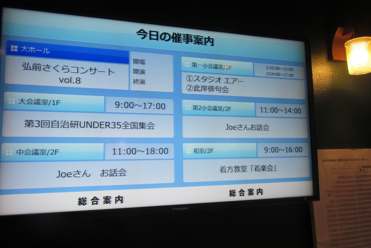 広大な弘前公園の敷地内の南西角辺りにあり、一般にはホールや会議室を備えた市のイベント施設ですが、弘前公園を訪れた観光客にとっては、建物内にレストラン(カフェ)や休憩椅子の置かれたロビーがあって、なかなか屋根付きの建物内で無料で休憩できる場所の無い公園において、貴重な足安めの場所となっています。