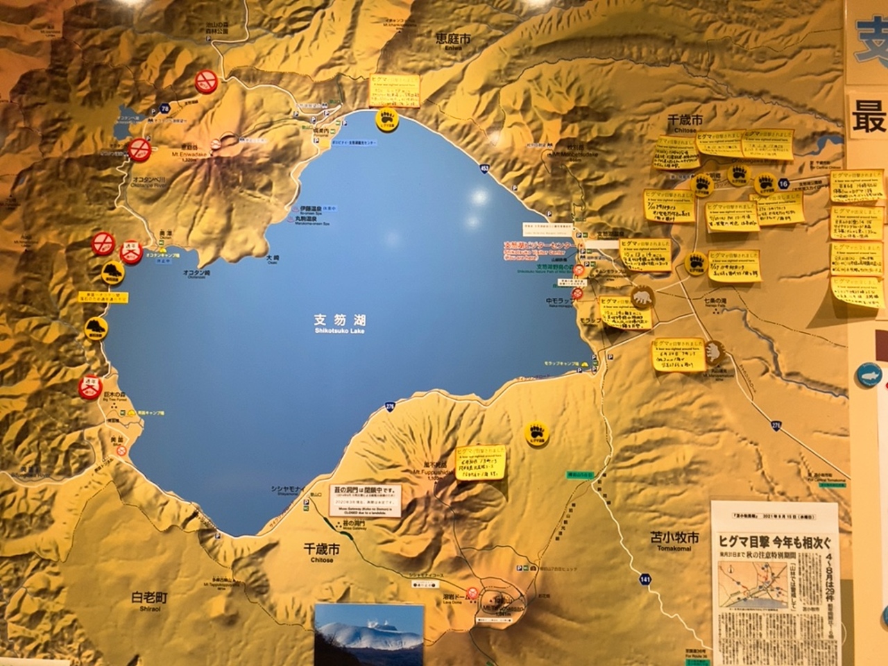 支笏湖ビジターセンターにも行って色々と学ぶ事が出来ましたが、支笏湖の最大水深は363mもあり、平均水深でも265mもあるようです。 面積で比べると琵琶湖の1/9しかありませんが、貯水量は琵琶湖の約3/4もあるようです! 貯水量の説明は、館内のパネルで、小学校の25mプールの約5800万杯分!と説明されていましたけど、これが分かりやすい量なのかそうではないのかすら分からない(笑)。