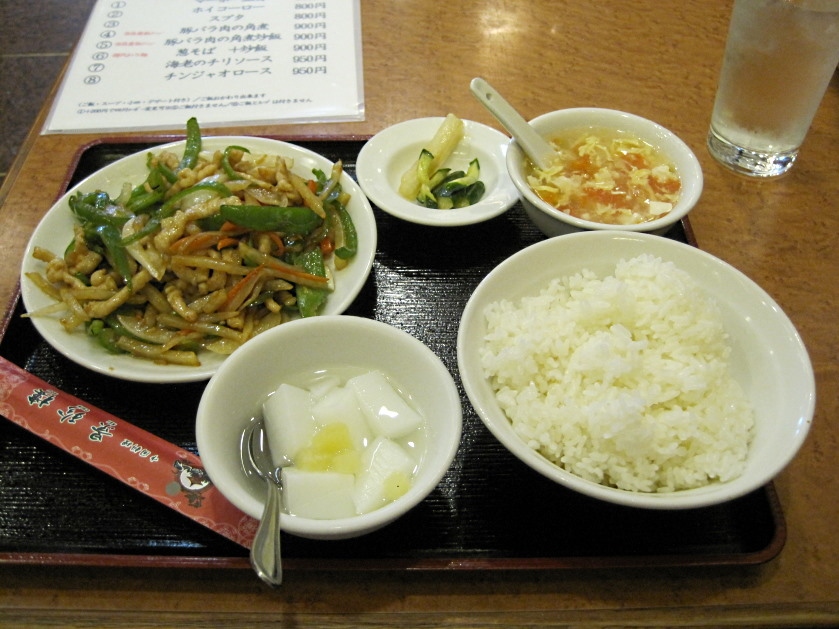 注文したのは豚肉とじゃがいもの細切りランチ、スープ・ライス・小鉢・杏仁つきです。これで700円税込みはお得です。