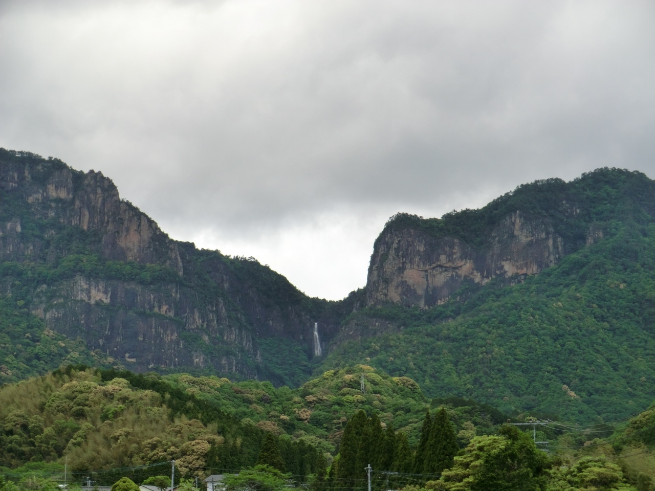 国道218号線を走って、行縢神社を目指します。第一鳥居が登山口ですが、すぐ横に駐車スペースがあります。照葉樹林の中の道を行くと、渓流に「滝見橋」が架かっています。この橋からは今は行縢の滝が見えません。この橋から20分ほどで、滝壺の入口に差し掛かります。滝つぼまで行かなくとも住宅地の入り口あたりで滝と山を眺めることができます。