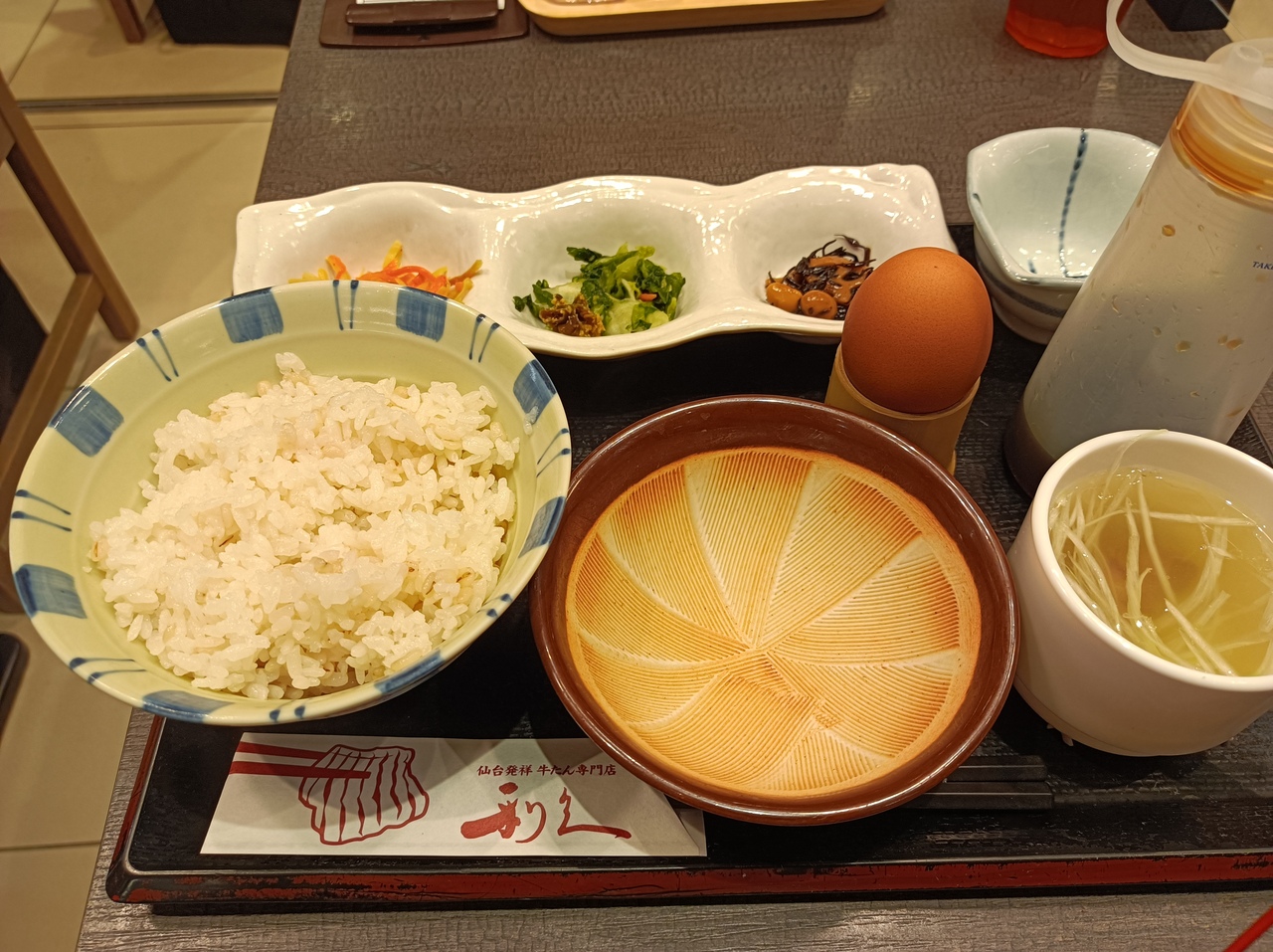 大宮駅改札内にある牛タン専門店です。普段は牛タンメインのお店ですが、朝食の時間帯に限り卵かけご飯定食を提供しています。こだわりの卵と牛タン専門店の小鉢をお楽しみください。写真は卵かけご飯定食550円です。