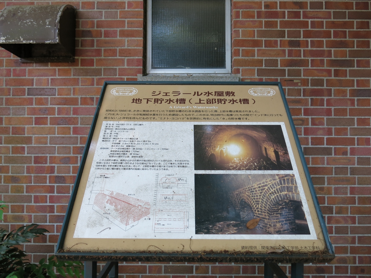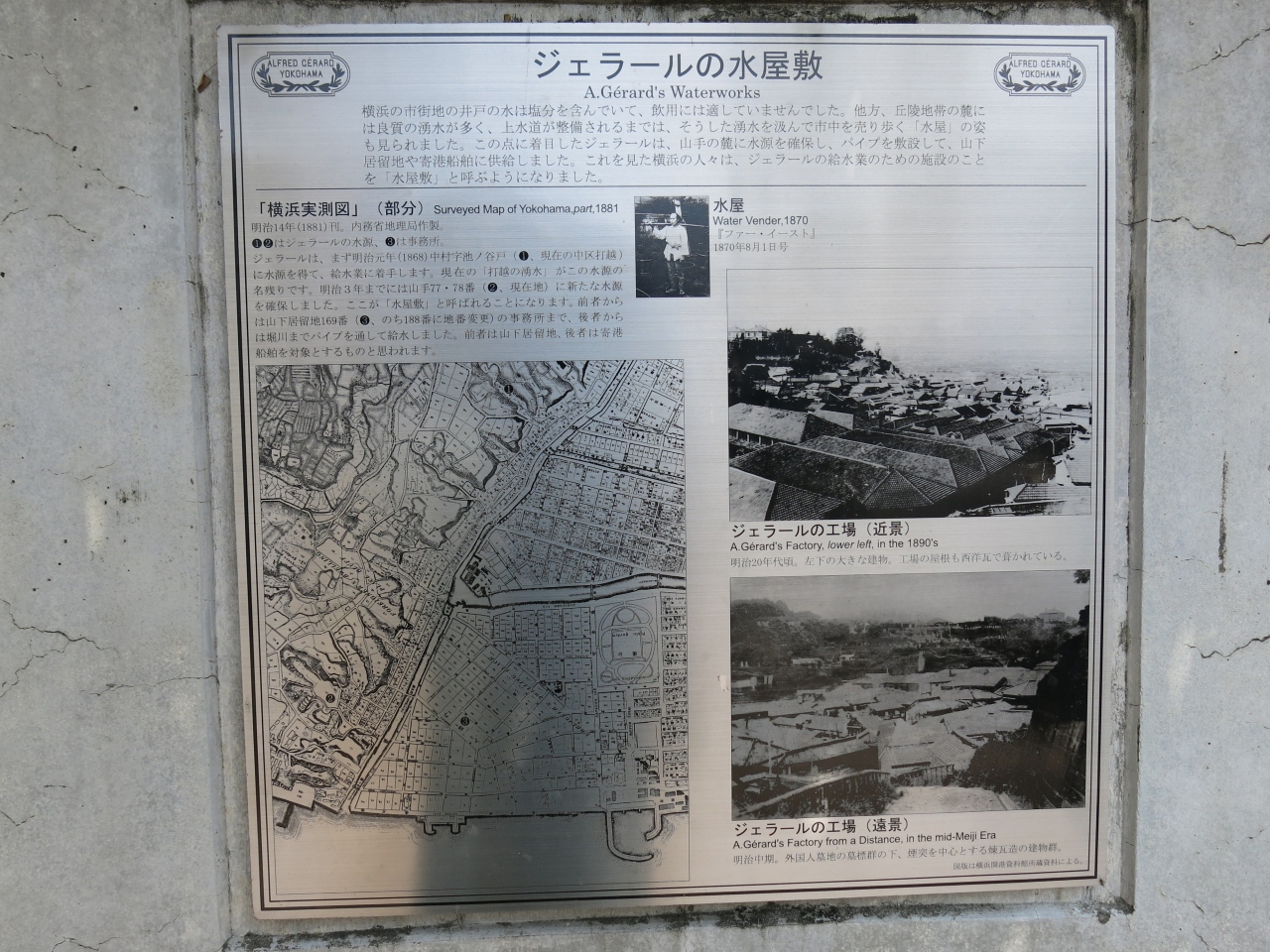 横浜の山手エリアにある元町公園内を散策していた時に、レンガ造りの建物の前に「ジェラール水屋敷」の案内板を見つけました。かつて横浜の井戸の水は塩分を含んでいたため飲み水としては適していなかったそうで、フランス人実業家のジェラールが山手の麓に水源を確保して給水業を始めたとのことでした。他にも、山手の湧水が残っており、当時このエリアで良質の水があったことが伺えました。