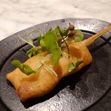 大阪の串揚げとフレンチをコラボさせたような串揚げでした。コースをいただきましたが、旬の素材を使って、とても目新しく、ワインもお料理に合わせて美味しくいただきました。