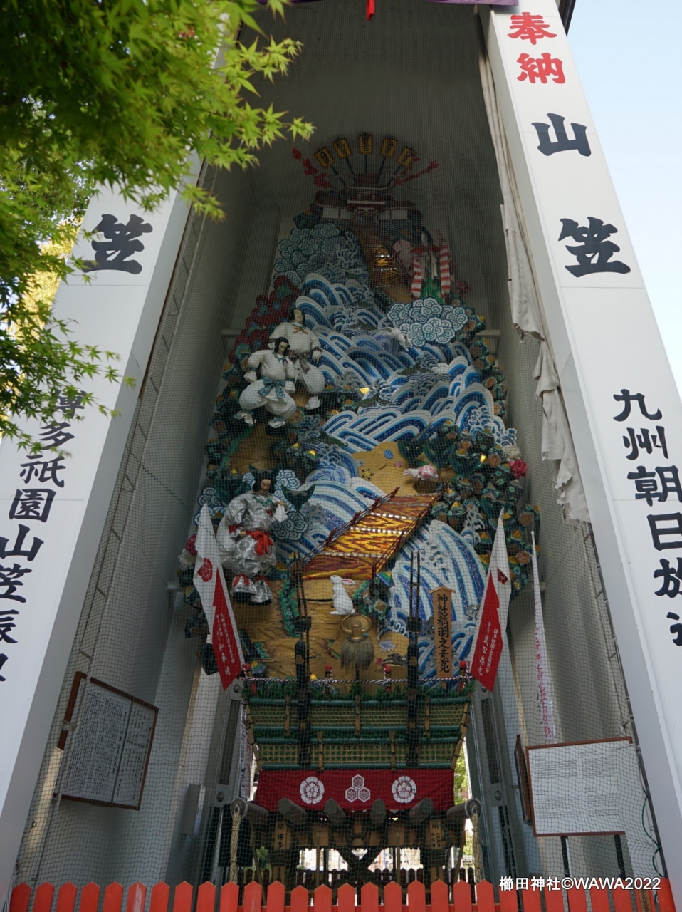 福博であい橋から川端通商店街のアーケード商店街をブラブラしながら徒歩30分ほどで櫛田神社に到着しました。TVニュースでしか見たことがありませんが、博多山笠祭りの豪華な山車が境内に展示されていて物珍しく旅行気分が味わえました。