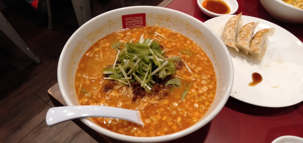 看板メニューの担々麺は「金胡麻」と「黒胡麻」の2種類あり、同行者と分けて食べましたが、どちらも程よい辛さで絶品の味。勢いで汁までゴクゴク飲みました。