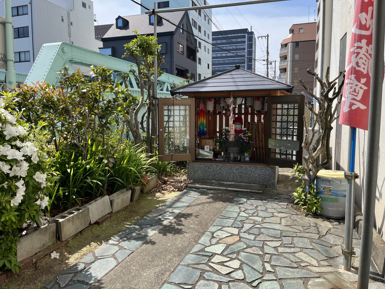 市堀川遊歩道として整備されているエリアを散策しているときに通りかかりました。大戦中に大空襲を受けた際に亡くなった方々を弔うために名づけられたとのことが説明板に書かれていました。和歌山市中心部にはほかにも汀公園にも供養塔があり、戦災のことを後世にまで伝えようとしている思いが感じられました。