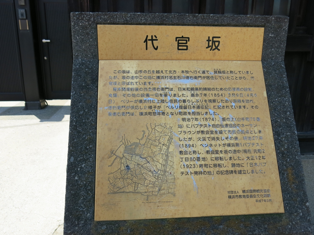 横浜の元町中華街から山手エリアに至る坂道で、オシャレなカフェなどがあります。人気のパン屋さん「ブラフベーカリー元町本店」もこの坂道の途中にあり、お客さんがひっきりなしに訪れていました。坂の途中に横浜村名主の石川徳右衛門が住んでいたため、代官坂と呼ばれたそうです。