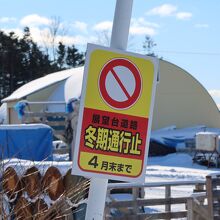 狭い雪道をバックで戻ると、立て看板があって、「冬季通行止め」となっていました。