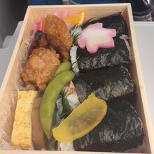 中身ですが、俵巻きのむすびが4個(鮭・梅・おかか等)の他、唐揚げ・白身魚のフライ・ハンバーグ・枝豆等が入っていました、