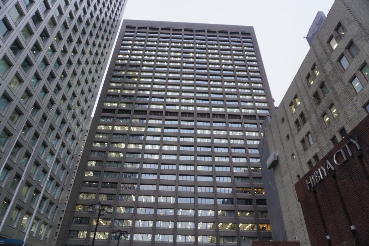 日本プレスセンターは、日本記者クラブ、日本新聞協会等が入居する国内報道機関の拠点。このビルは日比谷シティを構成していて。日比谷公園側から見ると正面に日比谷国際ビル、左手が富国生命ビル、右手がこのプレスセンタービル。日比谷国際ビルと富国生命ビルは高層ビルなので、地上11階のビルでも、比べるとこの写真のように高さが全然違います。