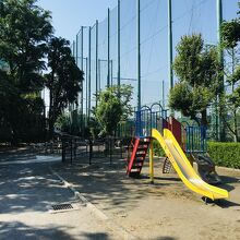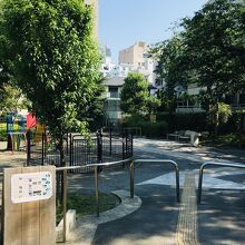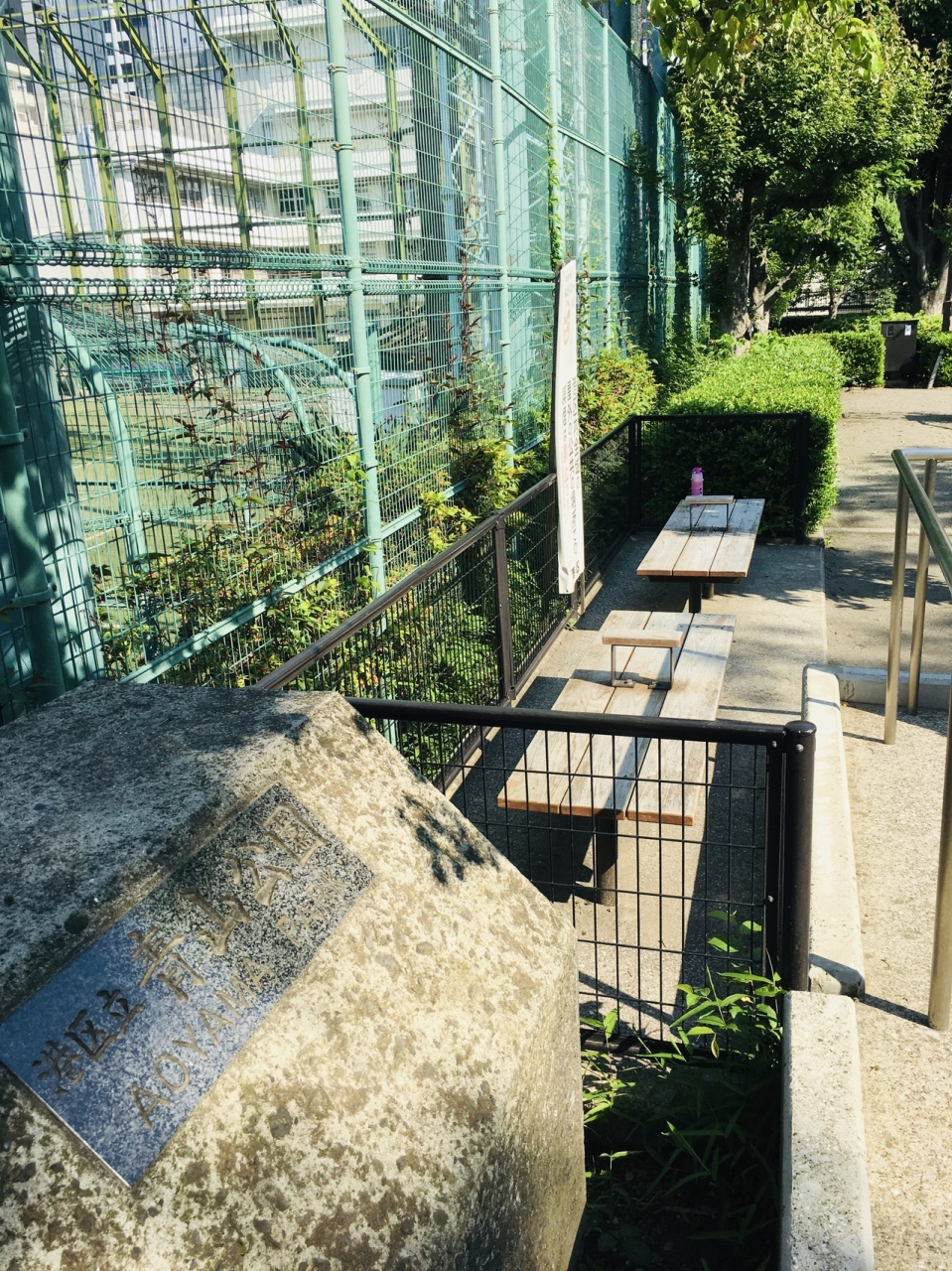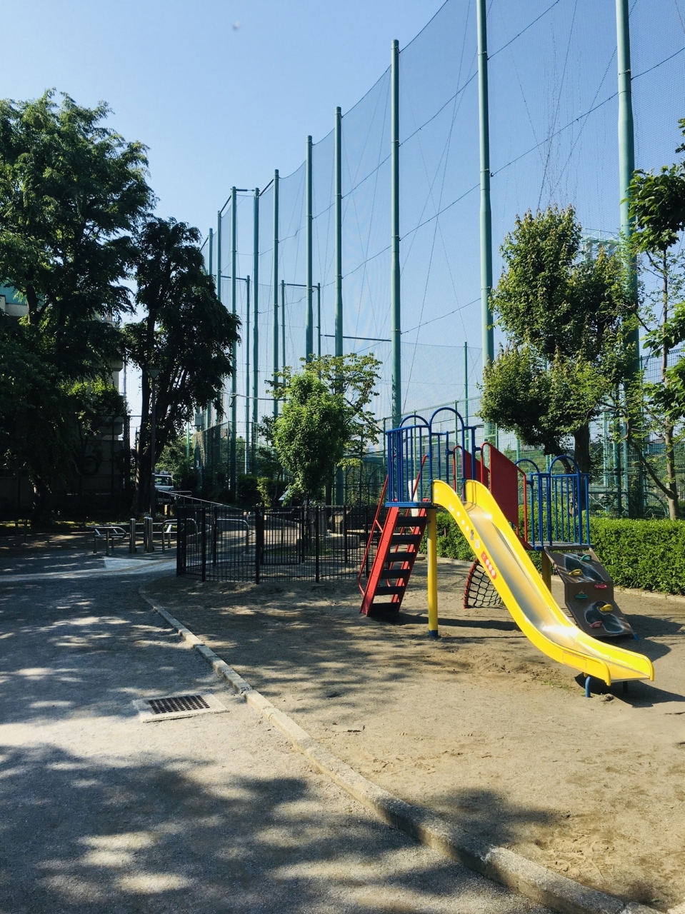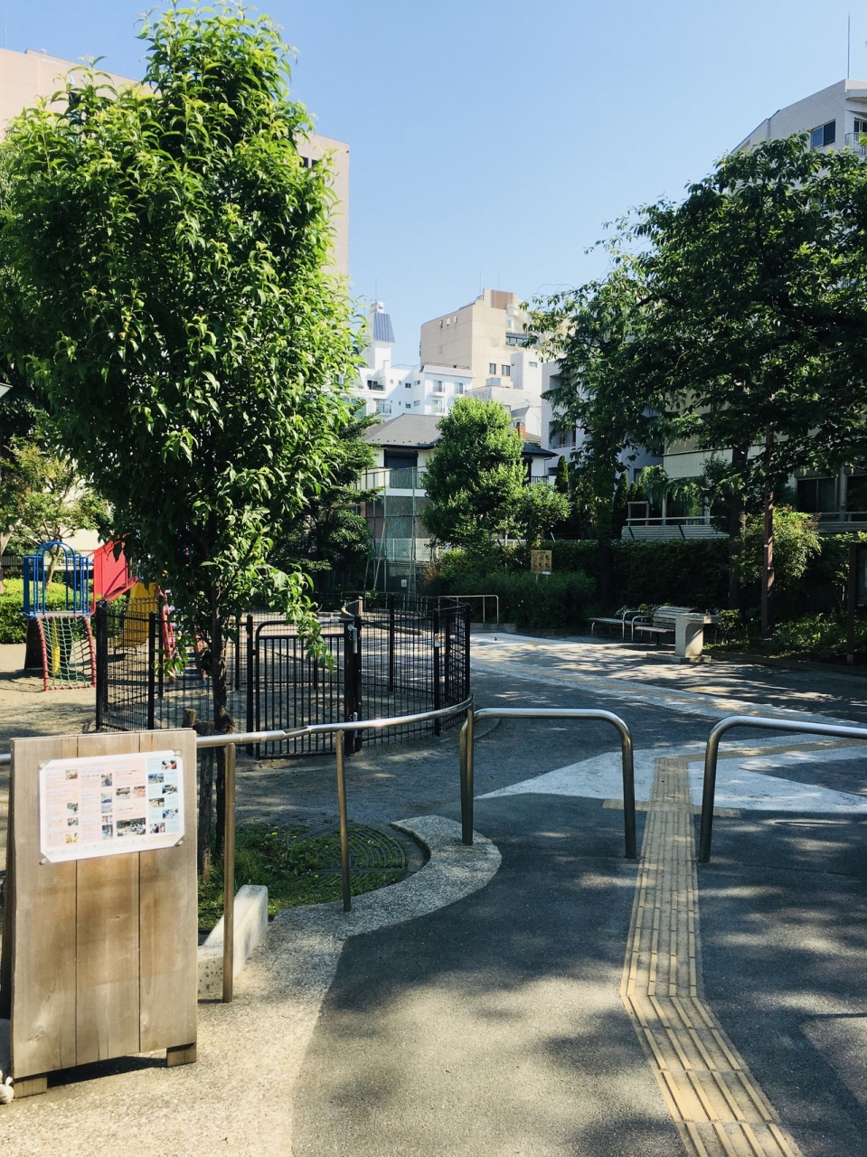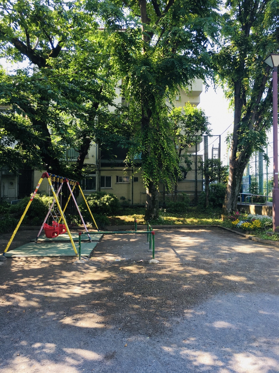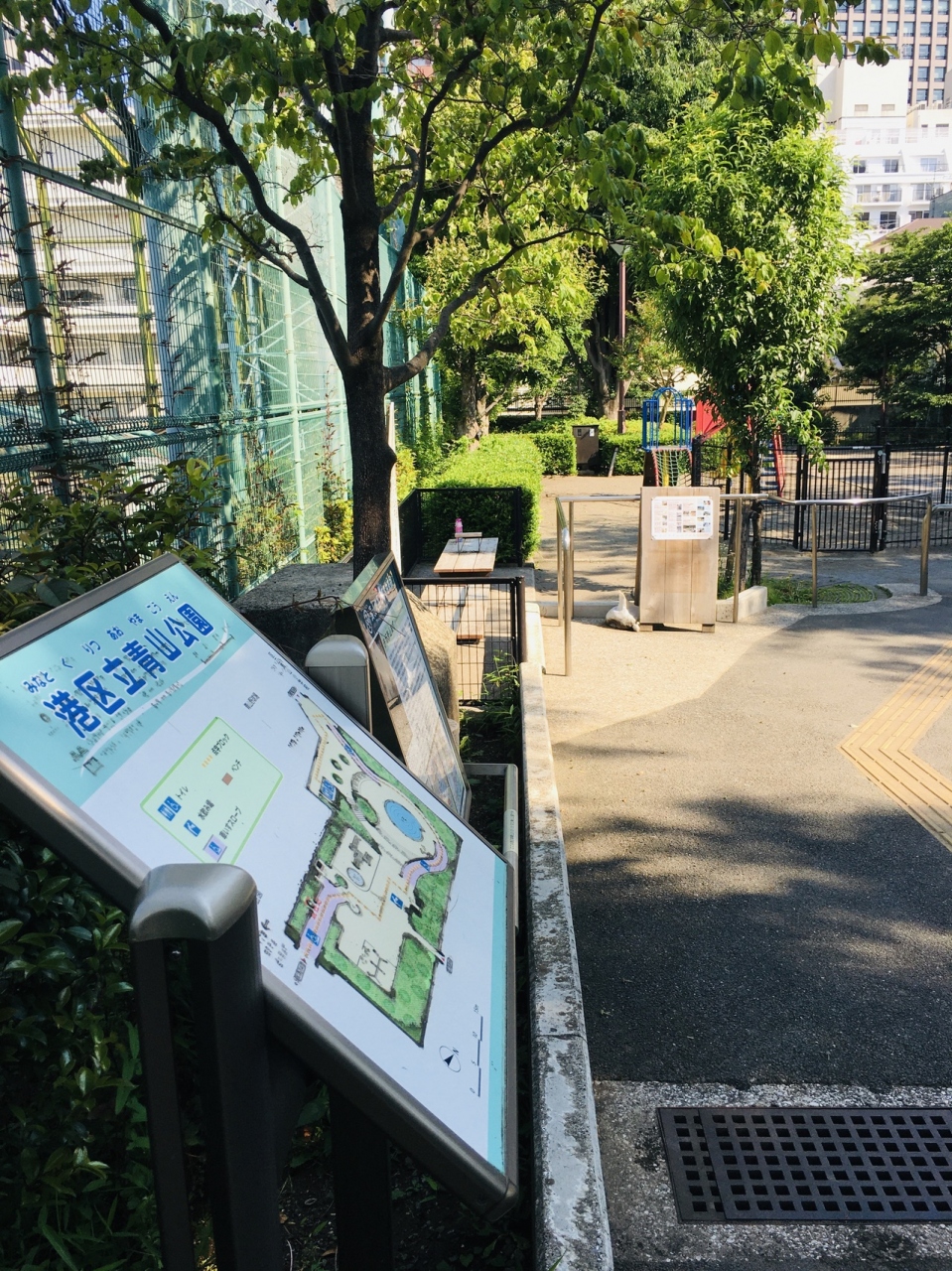 青山墓地に隣接していますが、細い道を抜けて奥まった場所にあり、分かりずらかったです。ブランコ、滑り台、砂場等がある子供向けの公園で、木々があり横はグランド、テニスコートがありました。住宅街に隣接した公園です。