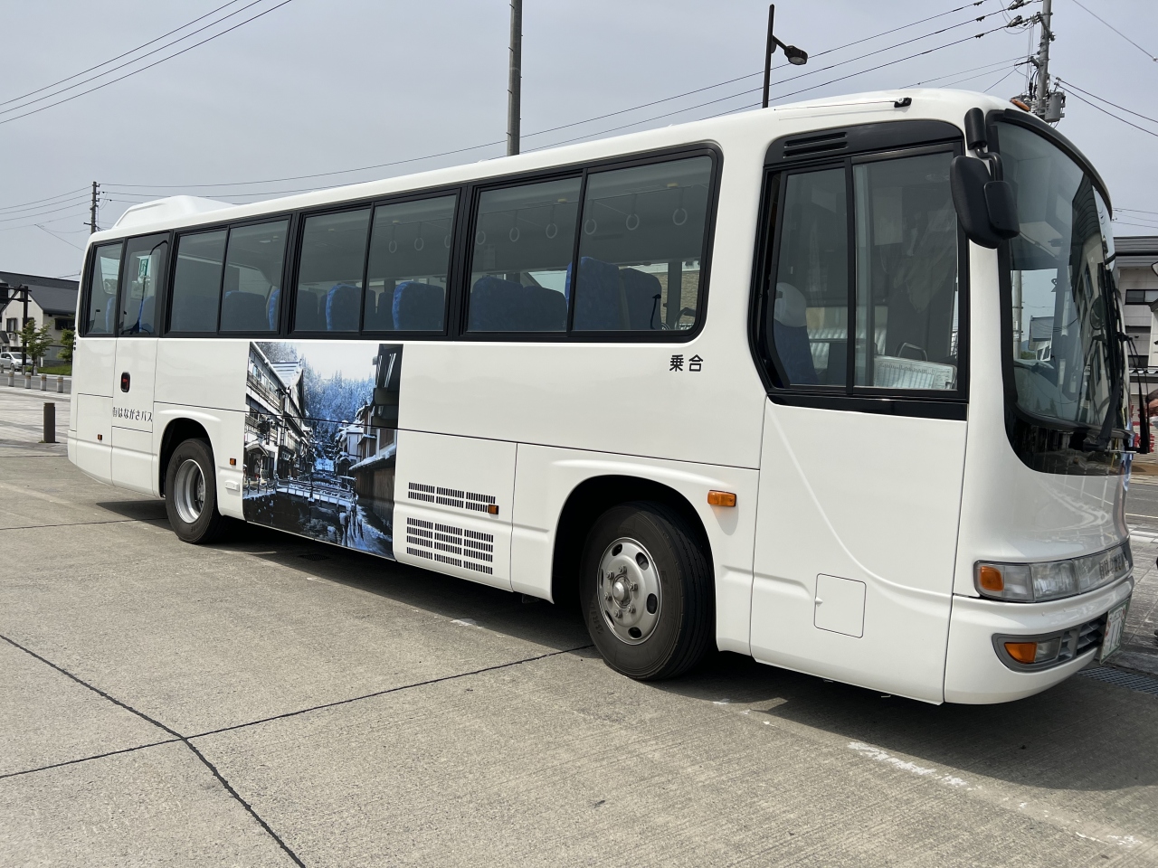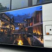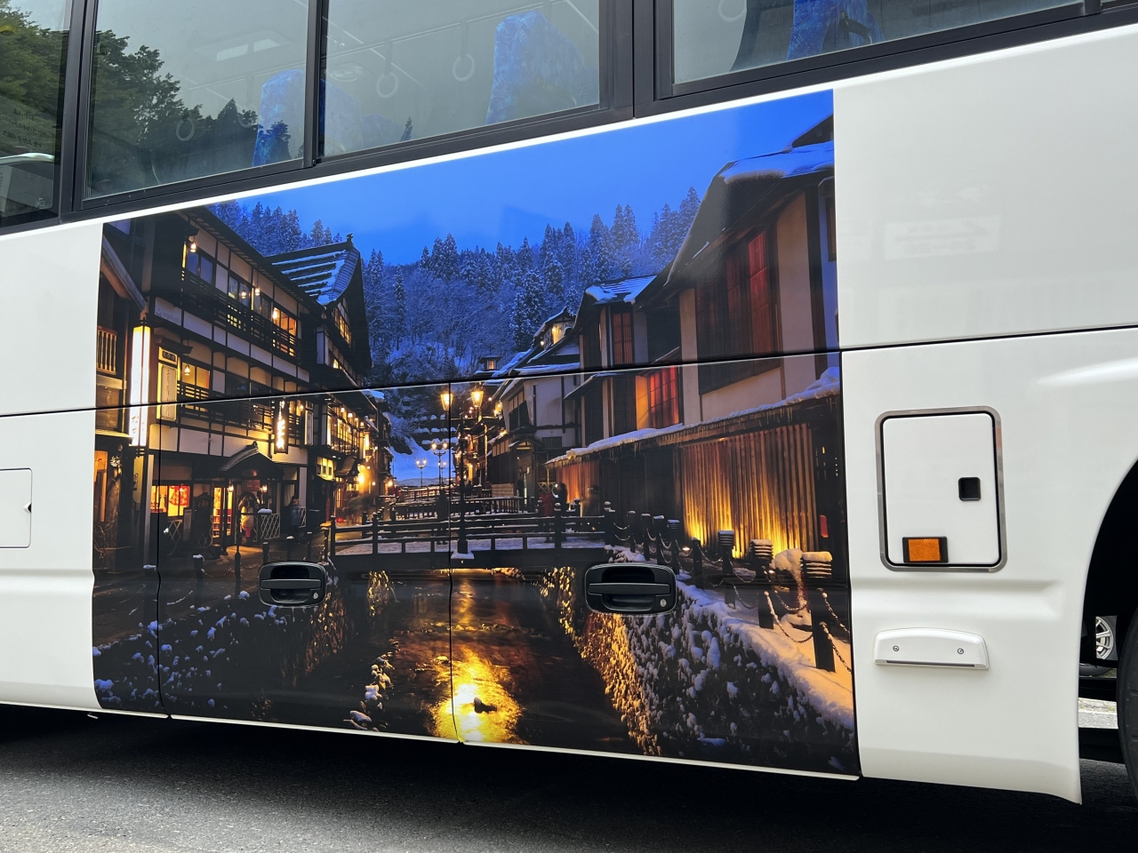 大型バスで車体には銀山温泉街の写真が掲示してあり、行くときは待望の銀山温泉観光なのでさらにわくわくしました。