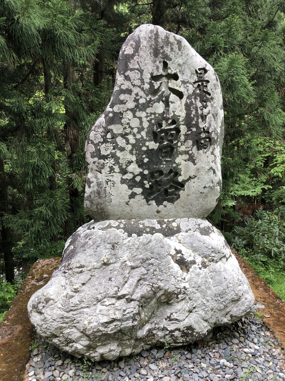 念願かなって「是より南木曽路」の石碑を訪れることができました。手元の地図には国道19号線の桜沢宿から北500mほどの西側沿いにあるように見えましたが、そのようなものは見つからずに通り過ぎました。日出塩駅付近まで行ってしまったので、スマホで調べてみたら、この地図が誤りだと分かり国道19号線を引き返すことになりました。県道254号線(ここにはカッパをシンボルにしている看板があります)を少し通り過ぎ、次の道(旧中山道)を左折するとすぐのところ、道路沿い右手にあります。桜沢茶屋本陣を営んでいた百瀬栄さんが1940年に建てたものだそうです。またかっては松本藩と尾張藩の境界でもあったそうです。