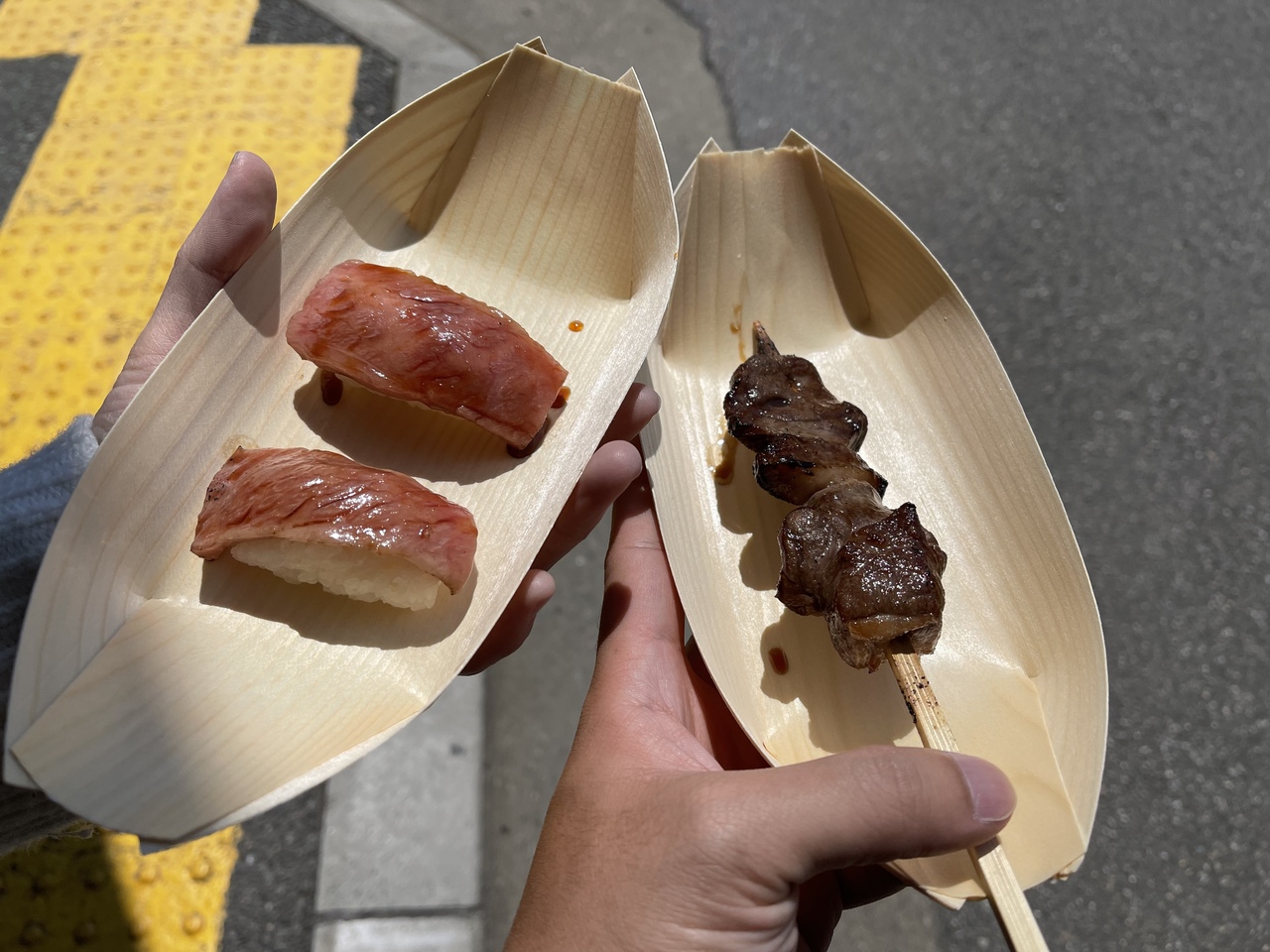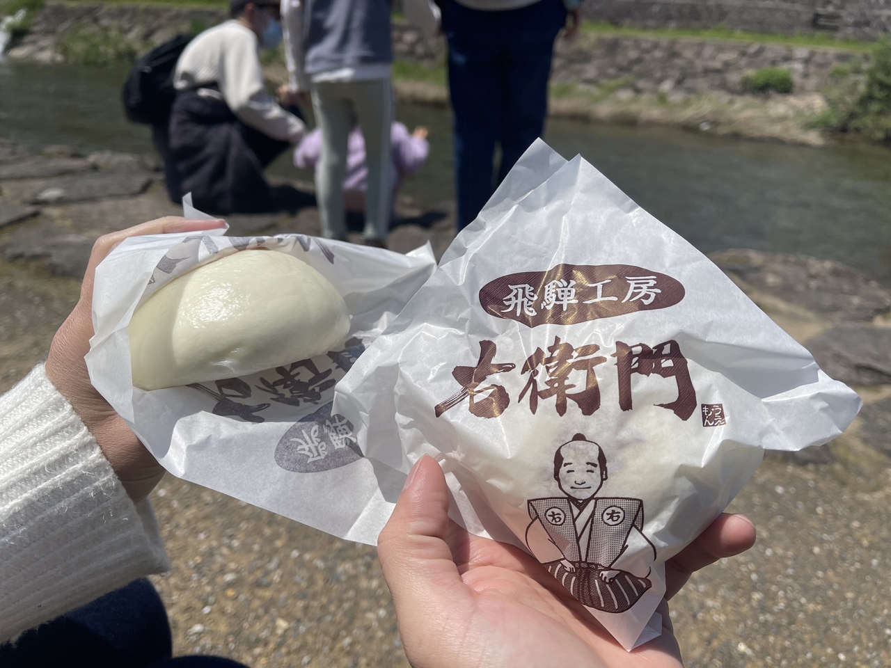 朝の10時半頃から町中をぶらぶら。朝市をひと通り覗いてから飛騨牛の肉まん、串焼き、寿司を堪能しました。天気が良ければ宮川の河川敷にあるベンチに座って優雅に泳ぐ鯉を眺めながら食べるのがオススメです!