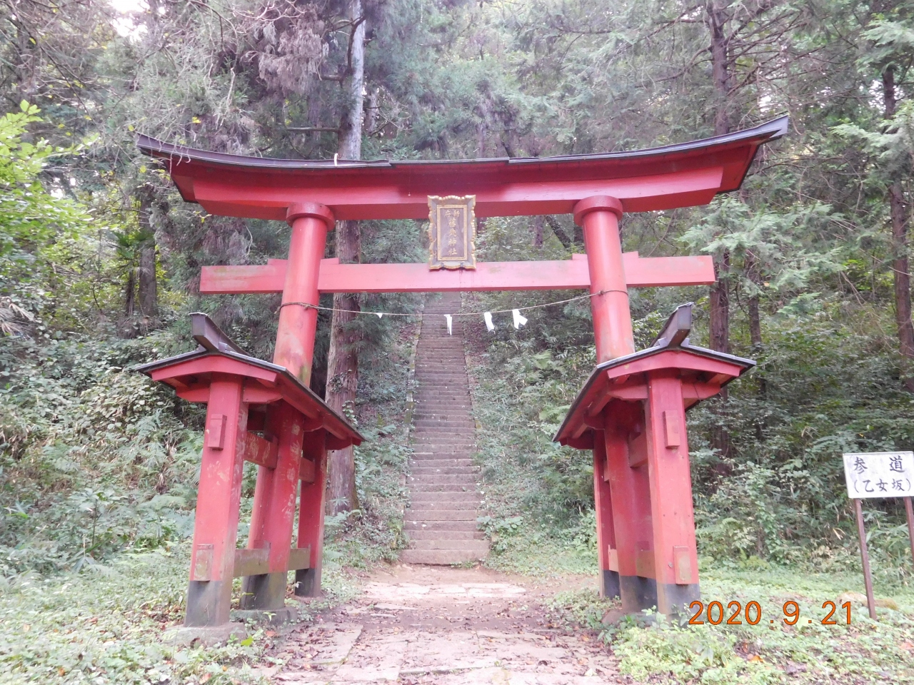 神社でご挨拶し、長い参道(乙女坂)の階段を降りると・・・立派な赤い鳥居が。