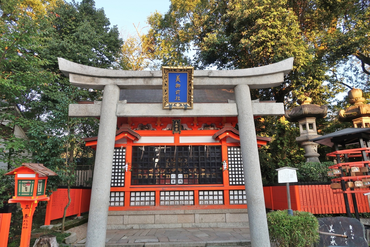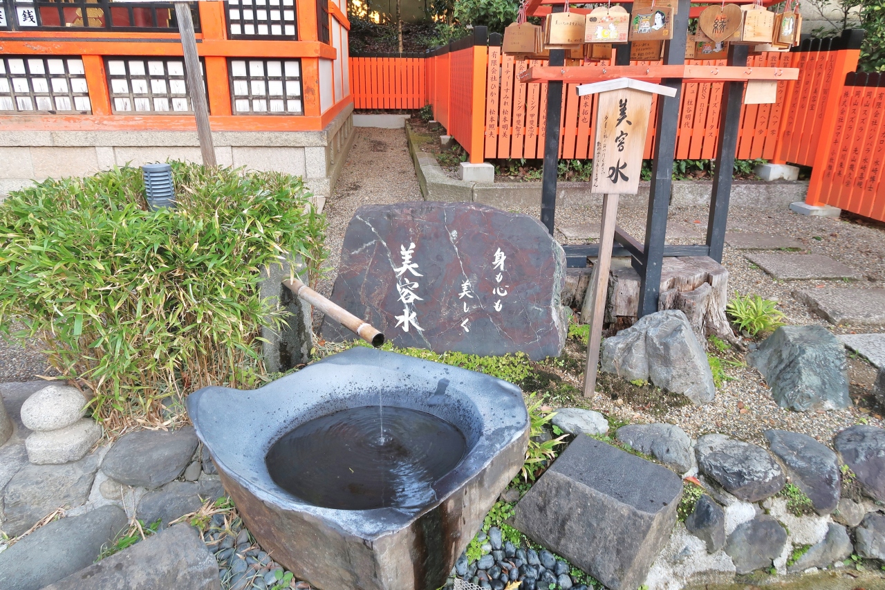 八坂神社本殿の東側にある末社で、日本の三美神である宗像三女神が祀られています。美を司るだけでなく、芸能、交通安全の神様でもあるそうです。社殿前には女神の霊力がこもっているであろう神水、その名も美容水が湧き出していて、「少量をお肌にお付けください」と書かれていたので、素直に指示に従いました。身も心も美しく清められて、コロナを遠ざけることもできそうです。