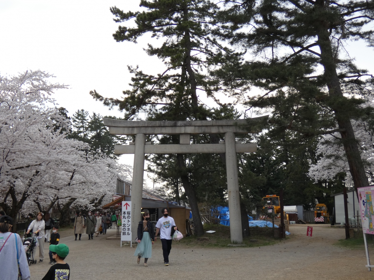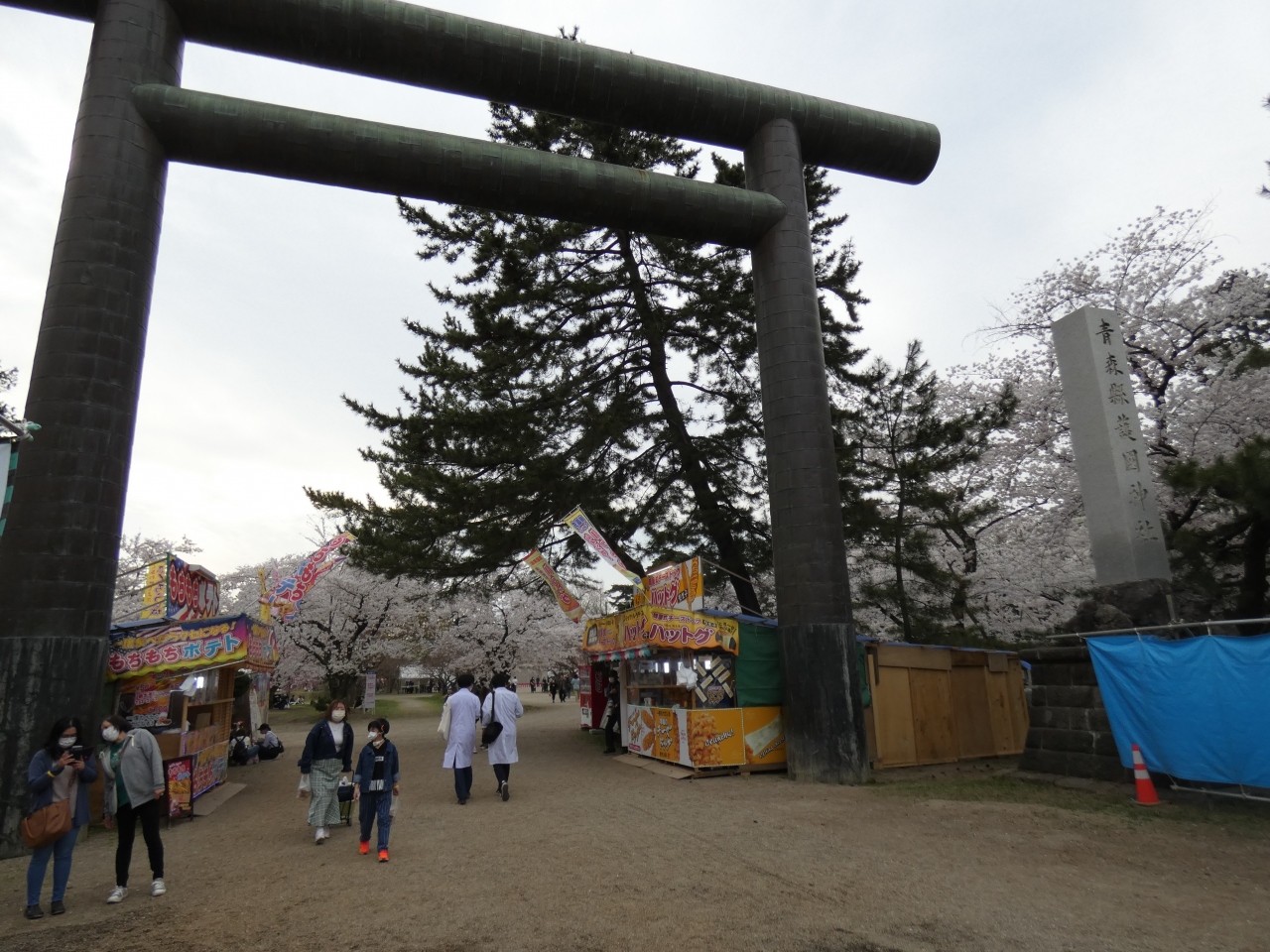 弘前公園(弘前城)四の丸に鎮座する神社。明治維新以後の戦争で日本の平和と家族を護るために亡くなった青森県出身の2万9184柱の英霊を神として祀っています。明治2年(1869)津軽藩12代藩主・津軽性昭により創建され、明治43年(1910)現在地に弘前招魂社として移築され、昭和14年(1939)内務大臣指定護国神社となったようです。付近はさくらまつりの観光客で賑わう区域です。