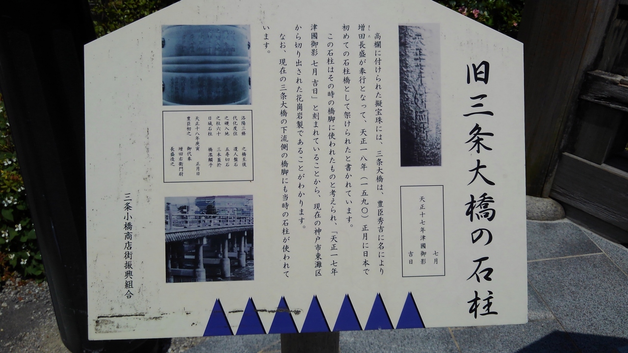 京都の名橋三条大橋の西北の袂にある三条大橋を支えていた石柱が展示されています。三条大橋そのものも何回通っても素敵だと思う歴史を感じる橋なのですが、この石柱は豊臣秀吉の頃、神戸の御影から運んできたものだそうです。