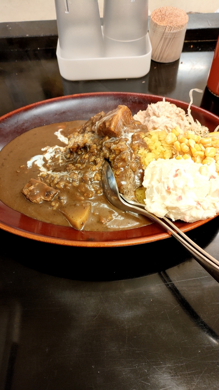 いつもの黒カレーにツナマヨ、マヨコーン、ポテトサラダのトッピング。