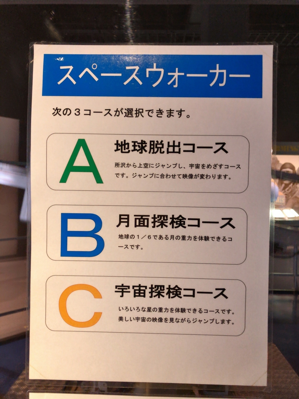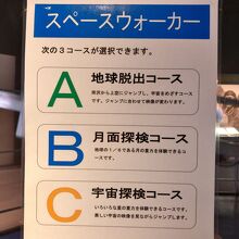 重力体験装置は3コースから選べます。椅子にのって、膝の屈伸を使って床をけると、たか~くジャンプできます。おすすめは月面探検か宇宙探検です。