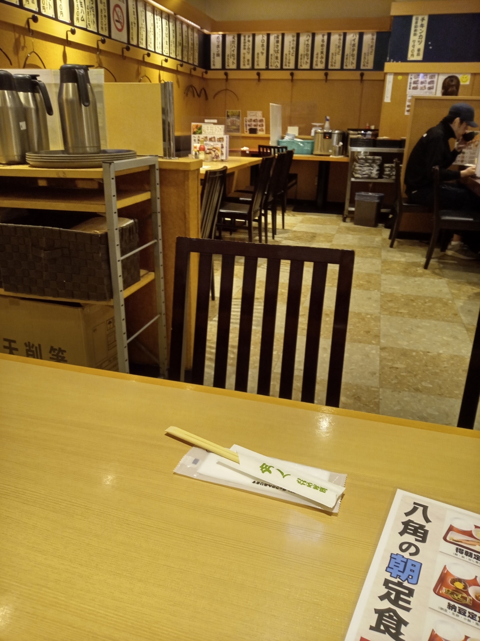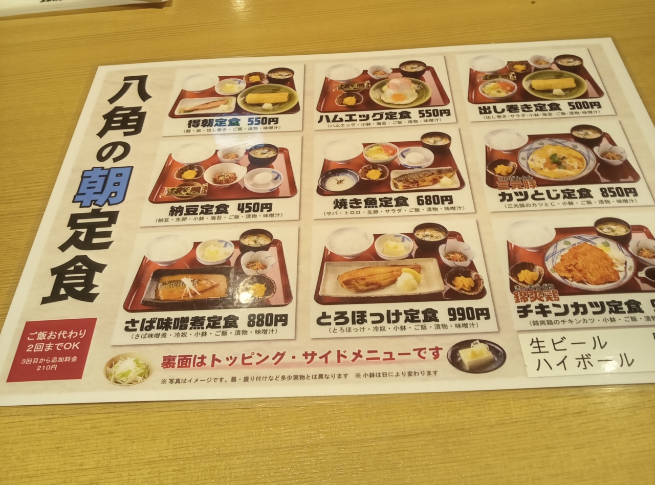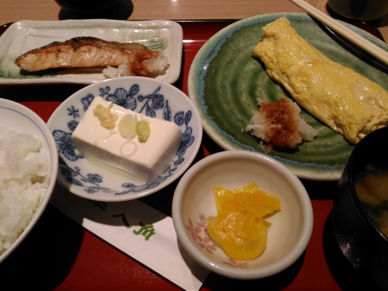 一番人気の得朝定食は、大きな出し巻たまご・焼き鮭・奴が付いて550円。