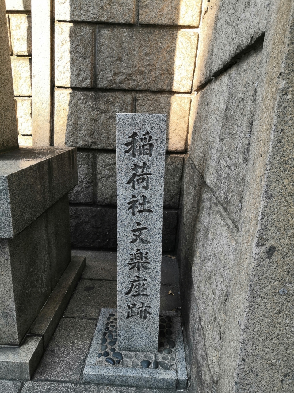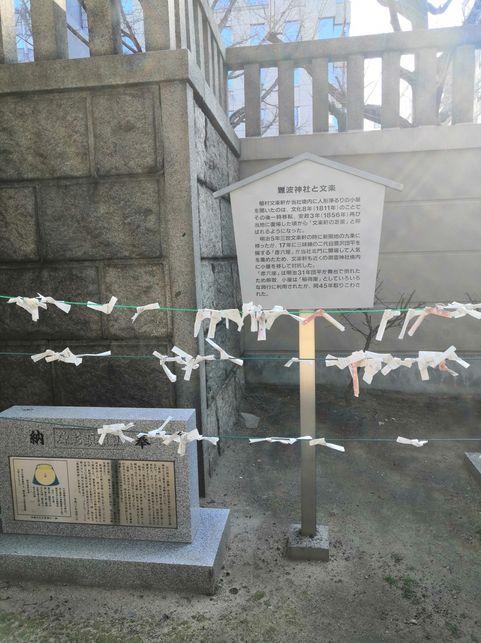 難波神社の東側の御堂筋川の入り口近くにあります。かつてはこの神社の稲荷社に浄瑠璃小屋があったりして文楽とのかかわりがあった神社の名残です。境内にはこの神社と文楽のかかわりについて説明の看板もありますが、この碑の近くにでもあったほうがわかりやすいかも。