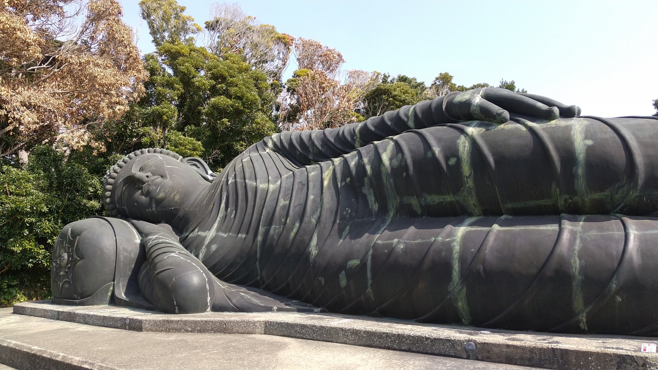 駐車場から坂道を10分程度、登った高台にある仏様。ガンダーラ様式で青銅の涅槃仏としては世界最大級とか。拝観料は大人500円。入口で線香をもらって、参拝の仕方を教えてもらう。台座を3周まわって参拝し、最後に足紋にふれて祈願するとのこと。体長16m、高さ3.75mの仏様は想像以上に大きくて、見応えがあった。