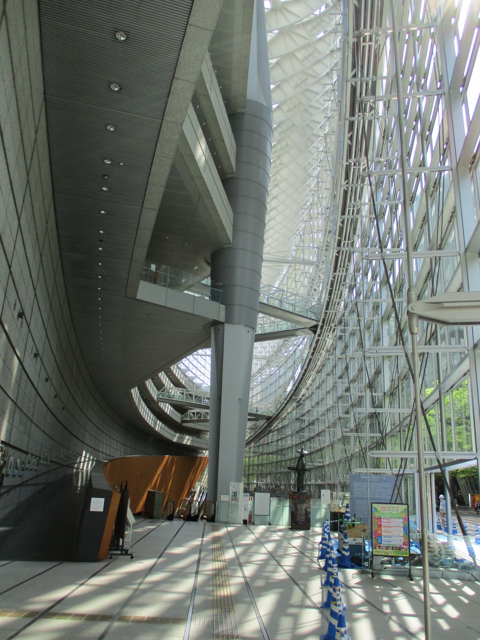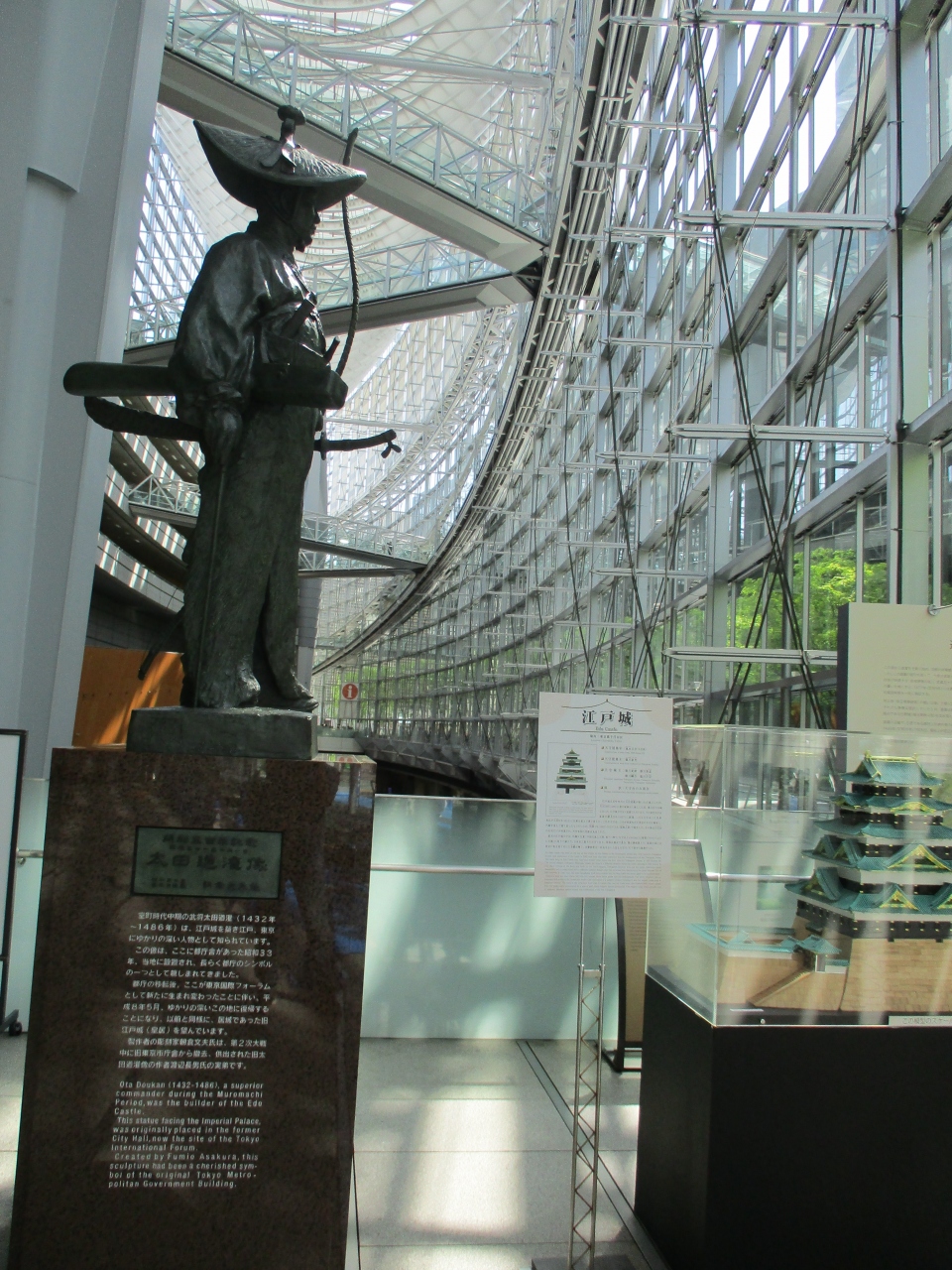 有楽町の駅前にある東京国際フォーラムに立ち寄りました。様々な展示会などが行われている都内有数のイベント会場です。建物のデザインがガラス張りの流線形なので、飛行船のようだと思いました。内部も吹き抜けが高くて明るかったです。入ったところに太田道灌の銅像もあり、威風堂々とした姿でした。