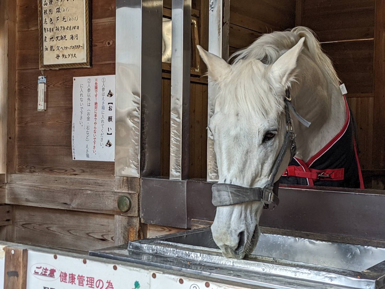 こちらには白馬が飼育されており、時間が合えば、人参を買って、あげることができます。