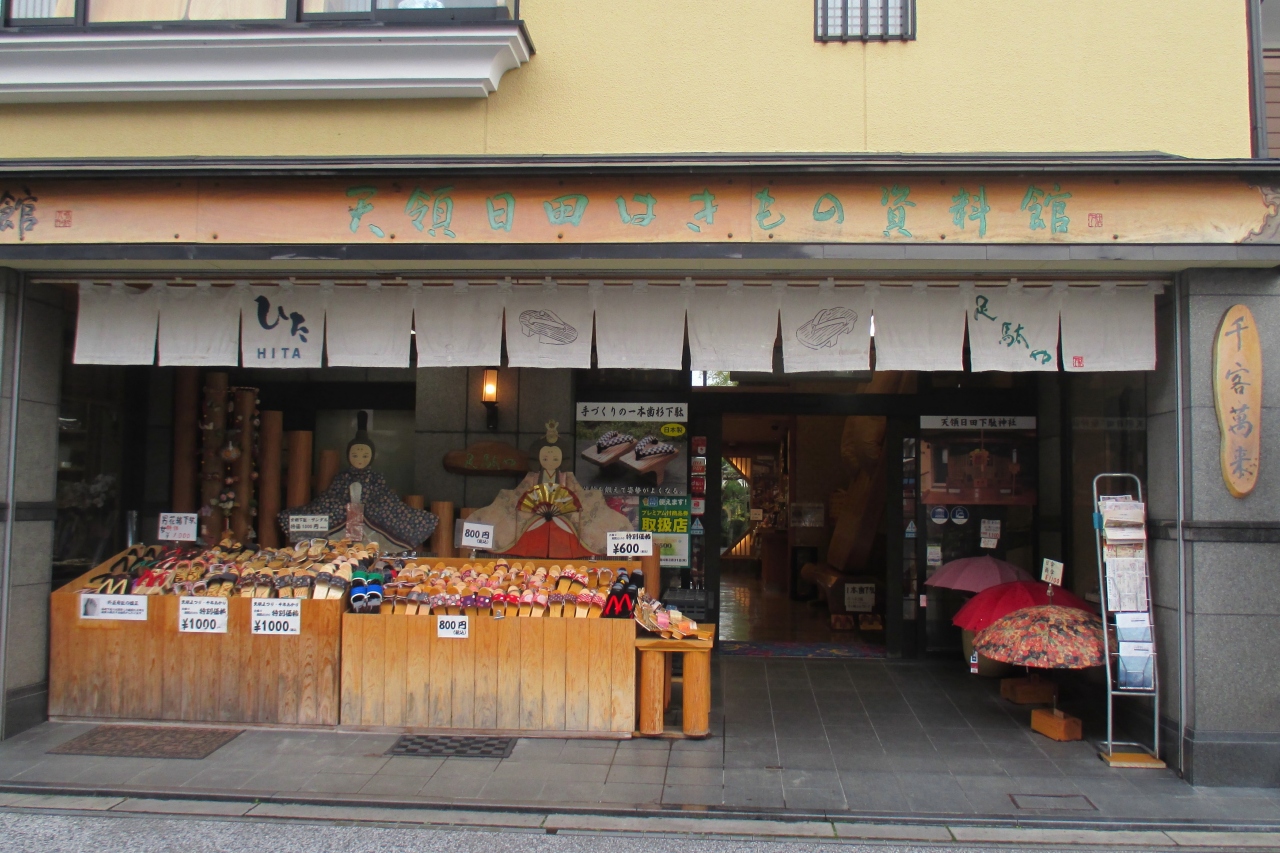 天領日田はきもの資料館は鳥市本店から上町通りを南へ進んだところにありました。日田ではきものといったら日田下駄のことなのですね。下駄そのものが日本固有のものですが、改めてじっくり考える前に、日常の目の前から消えていった感じです。館内に日本一という超巨大下駄がありました。長さ4m、幅2m、重さ1tだそうです。仲良く記念撮影しておきましょう。
