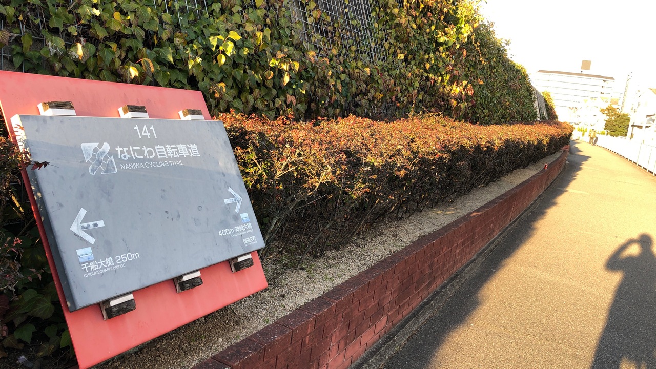 大阪市内のサイクリングロードです。阪神出来島駅から、神崎川・淀川沿いに、昔の赤川鉄橋まで、約20kmほどのコースです。ずっと川沿いなのが、水の都・大阪らしいなと思います。すれ違えるぐらいの狭めの自転車道です。