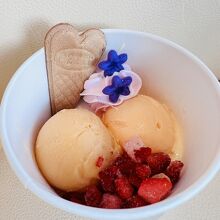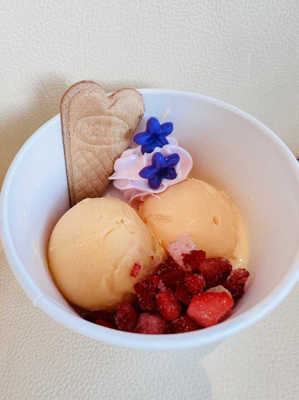 ジェラートは柑橘ミックスとメロンの2種類で、細かく刻んだストロベリーが入っていました。