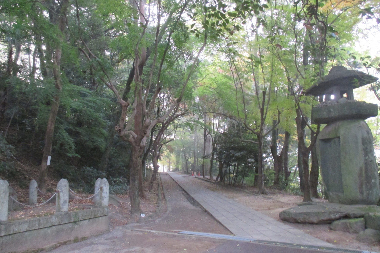 日田三丘陵の一つ、日隈山を中心とした公園で、三隈川沿いに位置します。直前のところで南北に分流した三隈川の北側の流れは、この亀山公園の先端を基点としてさらに分流しています。隈町側からは沈み橋で渡ることが出来ます。古くはここに日隈城が築かれました。