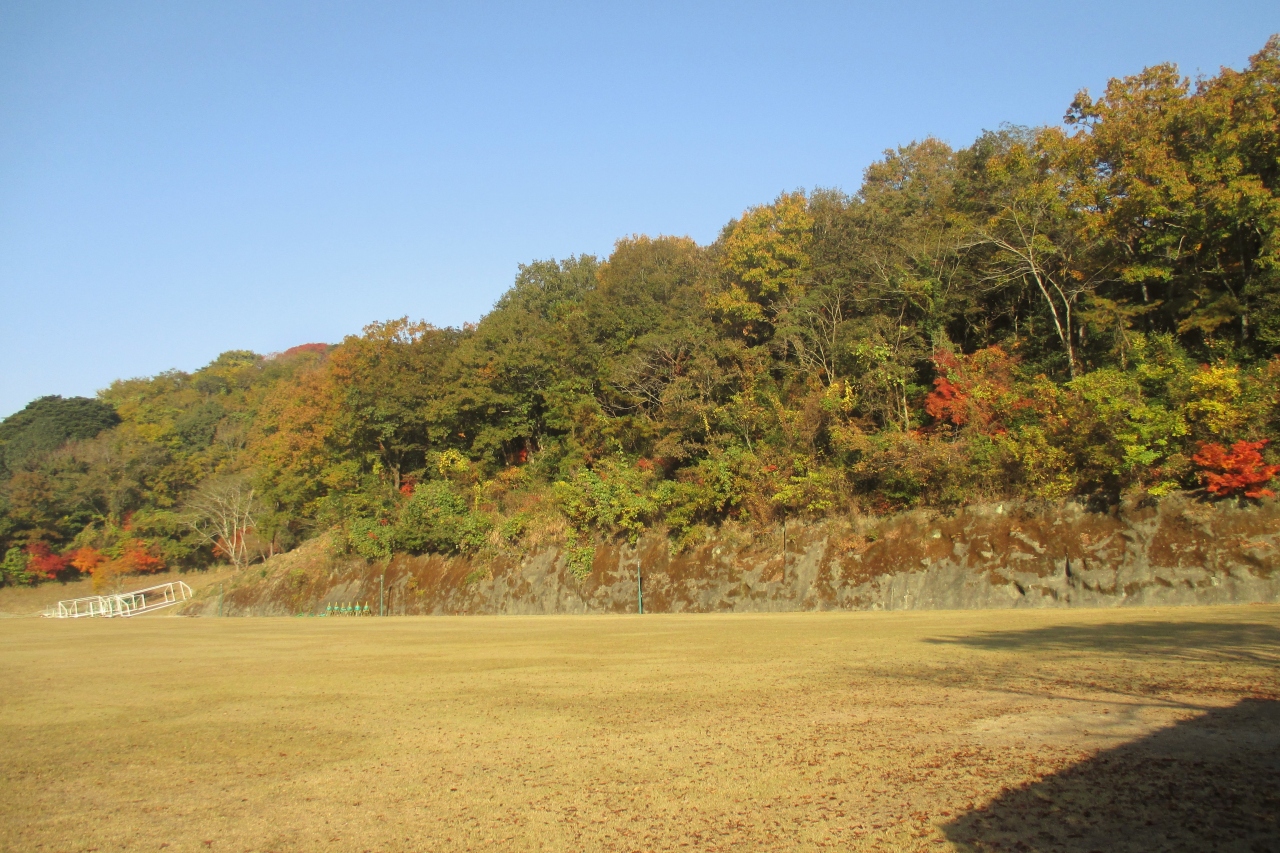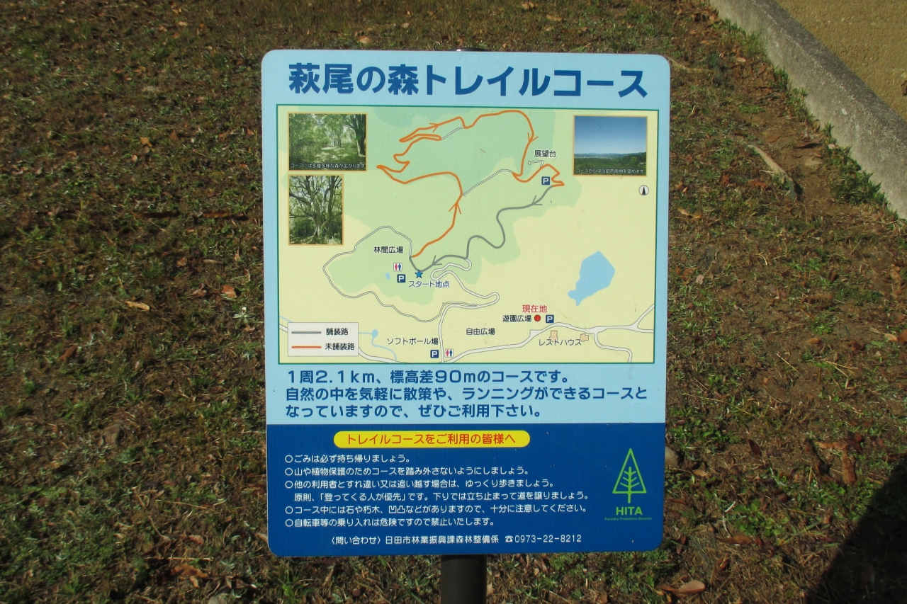 日田往還朝倉街道だった道を進んだところに萩尾公園がありました。利用者が多くなるお花見の季節でもなく、夏のキャンプシーズンでもない、11月の平日に訪れたら無人の公園でした。休日であれば、グランドや遊具の利用者があるのでしょう。周りを見回すと、緑と紅葉が多く、自然豊かなところだから出来た公園なのだと思いました。それを生かした萩尾の森トレイルコースというのも設定されていました。