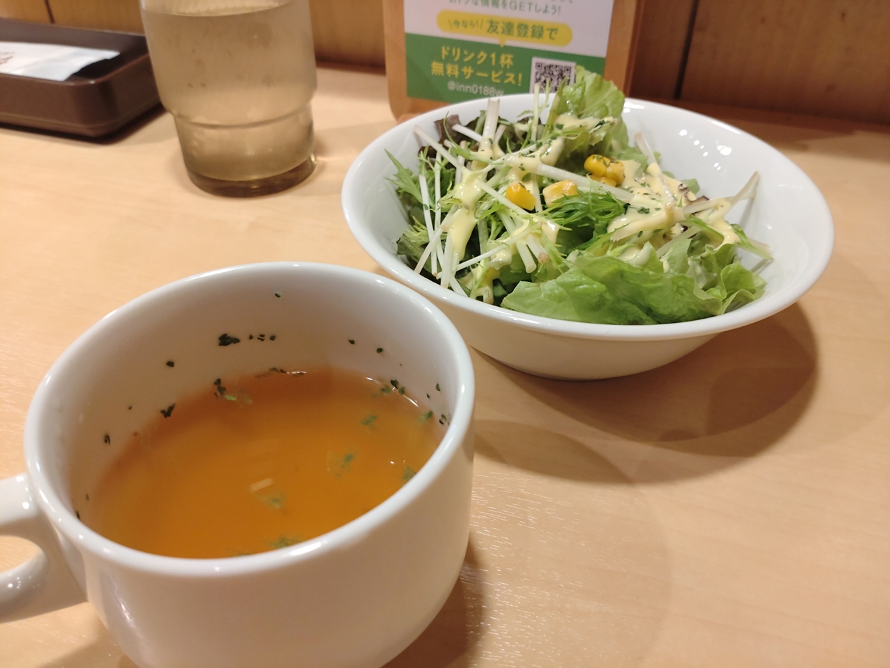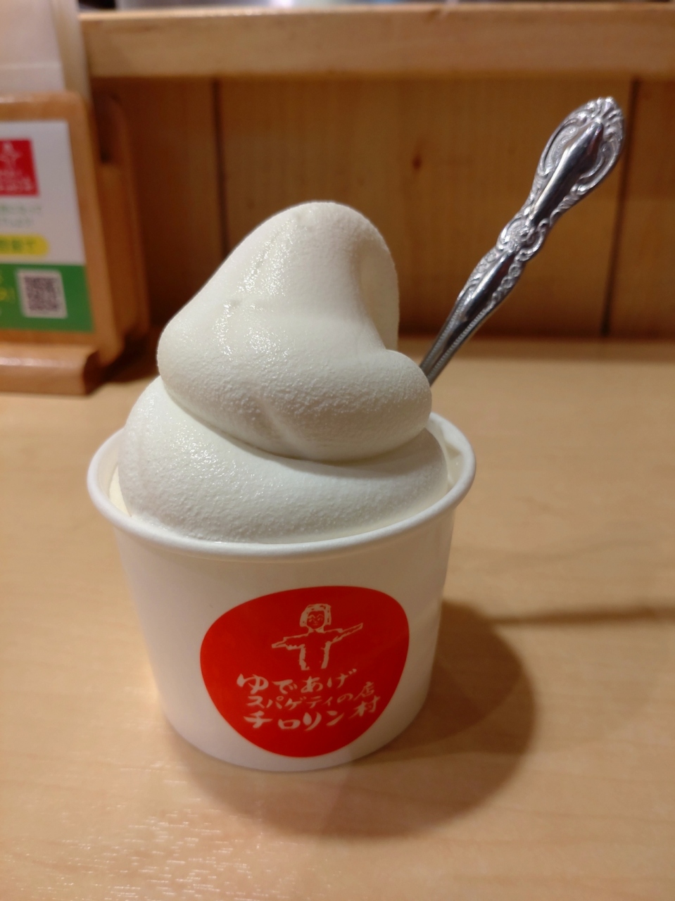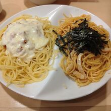 平日のランチのみのメニューですが、南2条店限定の「ハーフ&ハーフLUNCH」は、1000円で2種類のパスタとサラダ、スープがついてお得。スパゲッティの種類は限られるものの、一番人気の「超絶濃厚チーミート」の選択が可能。今回は、この超絶濃厚チーズミートといか明太子を選択。ひき肉、玉ねぎ、セロリ、にんじん、イタリア産完熟トマトを半日かけてじっくり煮込んだミートソースに、「超絶チーズ」と呼ばれる熱々の特製チーズを、目の前でかけてくれます。3種のチーズに生クリームを加え、バーナーで炙ったチーズはかなり濃厚で、ミートソースに負けない味。いか明太子は、明太子の辛さとパスタが良いあんばいで、いかの食感がまた良い。プラス100円でつけられるミニカップソフトは、牛乳の味がしっかりするもので美味。