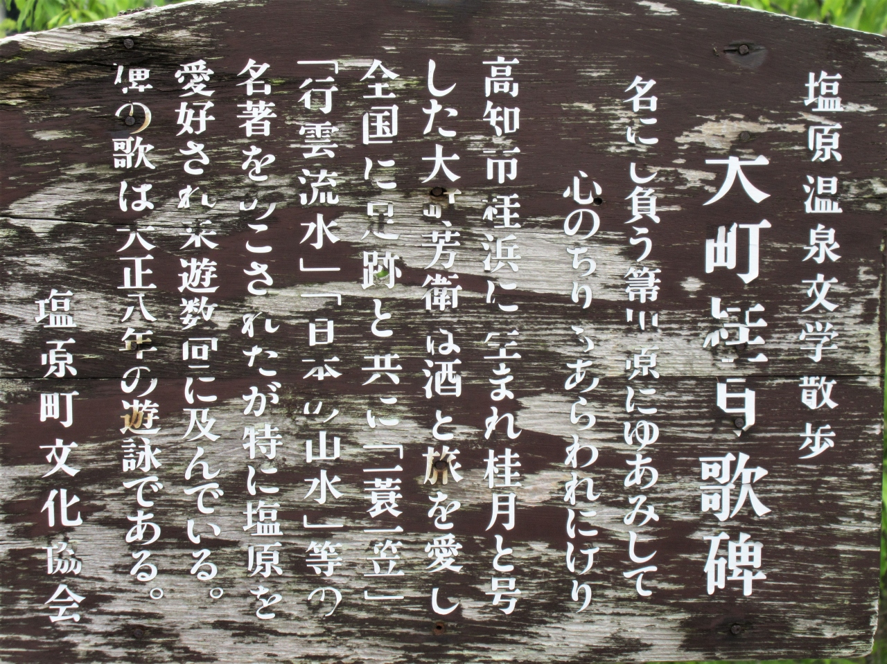 塩原街道を進むと、八方ヶ原に向かう八方道路と分かれるところが、門前温泉街の入口にあたります。そのすぐ近くに、明治時代の評論家・詩人だった「大町桂月の歌碑」があります。