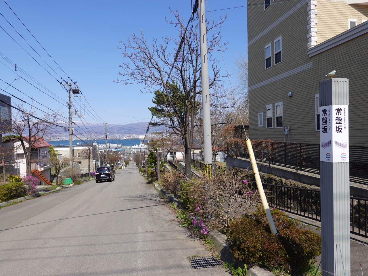 「常盤坂」は、函館の坂の中ではさほど特徴を感じない坂でした。かつては坂の途中に遊郭があり、遊女を振り返る男性から「見返り坂」の異名があったということですが、現在は閑静な住宅街という印象でした。 坂のはるか先には海が見えますが、道沿いには電線の姿が多く、美観を損なっているように感じました。