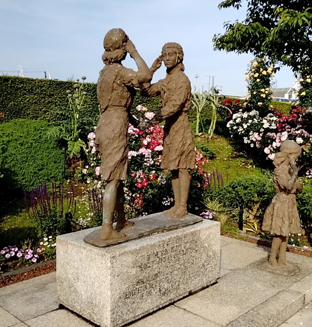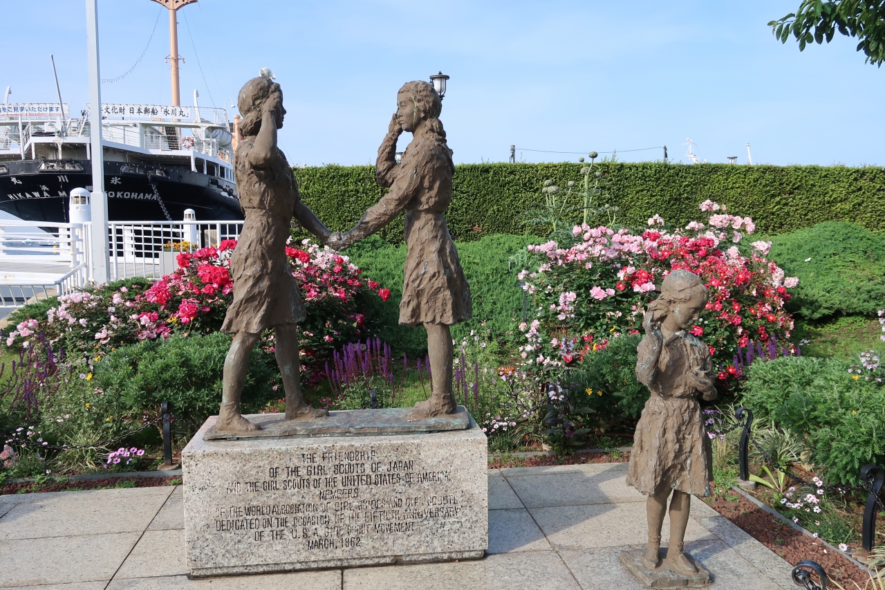 氷川丸をバックに、右手で敬礼しながら、左手で握手している少女像がありました。左の少女はアメリカ人、右が日本人、手前で一人で物思いにふけっている女の子はアメリカ人と、それぞれモデルがいるそうです。少女たちのまわりには、ピンクや赤、白の薔薇が美しく咲き誇り、国を超えたガールスカウトの友情に花を添えていました。