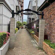 グラバー園と新地中華街の中間にある、旧英国領事館と隣のマンションとの間にある小路です。遊歩道になっているのでのんびりと歩け、ちょっとした散策路といった感じです。旧英国領事館は現在保存修理中で入ることができません。オランダ通りからは一部シートに覆われていますが、赤レンガの美しい建物を見ることができます。