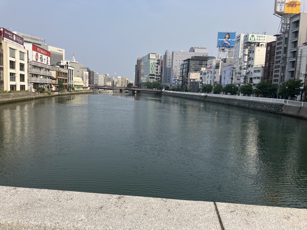 ホテルからキャナルシティ博多に向かう際や中洲方面に行く際に何度も通りました。大きな川なので、橋も大きいし交通量も多いです。すぐ近くで中州の屋台もあり、観光客も多かったと思います。特別綺麗な川ではなく、ごくごく普通の川です。笑