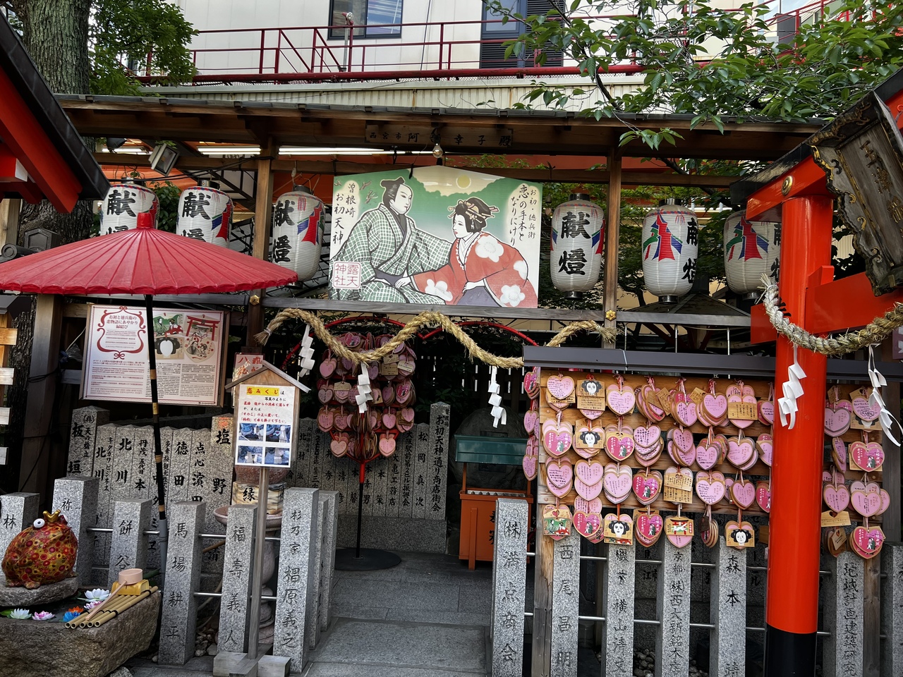 境内で起こった心中事件をモデルに、近松門左衛門が人形浄瑠璃「曽根崎心中」を書いたことで有名。境内には「恋人の聖地」として顔ハメ看板やお守りが売られている。