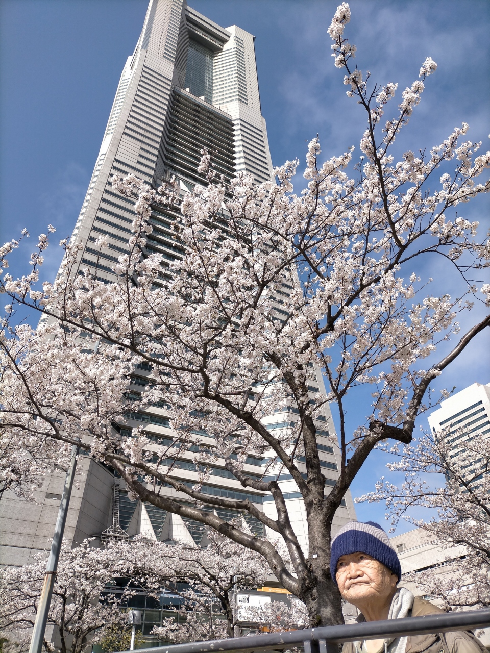 横浜ランドマークタワーをバックにもこもこの桜の花との最高のショット!