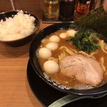 豚骨醤油がベースのスープにチャーシュー・ネギ・うずらのトッピングが基本。同じ家系ラーメンでも異なるのか、こちらの店舗はライス無料は学生のみで全時間帯で小が100円、大が150円(だったかな)と別途料金がかかるようです。個人的にはラーメンとライスは切り離せないので無料で食べれるようになると嬉しいところですが・・・