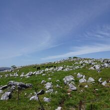 愛媛側の東の方に位置する五段城標高1456メートルの麓の高原です。四国カルスト公園縦断線沿いから容易にアクセスでき、羊の群れのように牧草地に石灰岩が点在、カルスト特有の景色が広がっています。