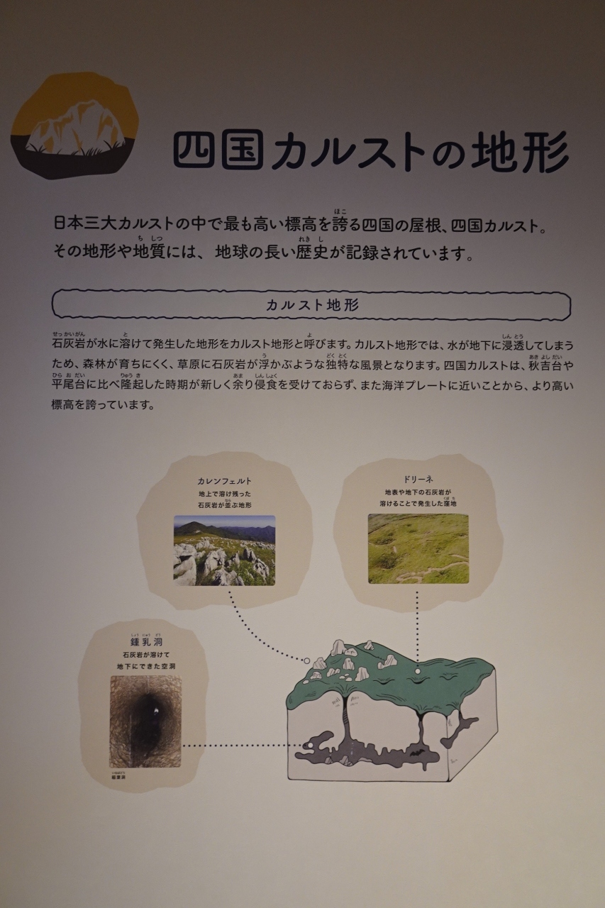 愛媛と高知にまたがる25㎞もの巨大石灰岩台地の四国カルストの東の方、高知県に位置する天狗高原にある四国カルストの博物館。隣接する星降るビレッジ同様リニューアルされ、とてもきれいです。四国カルストの成り立ち、生息する動植物などがわかりやすく学習できます。テラスからの眺望も絶景でした。
