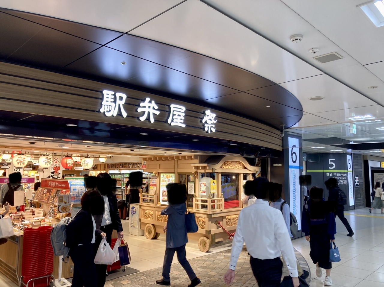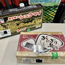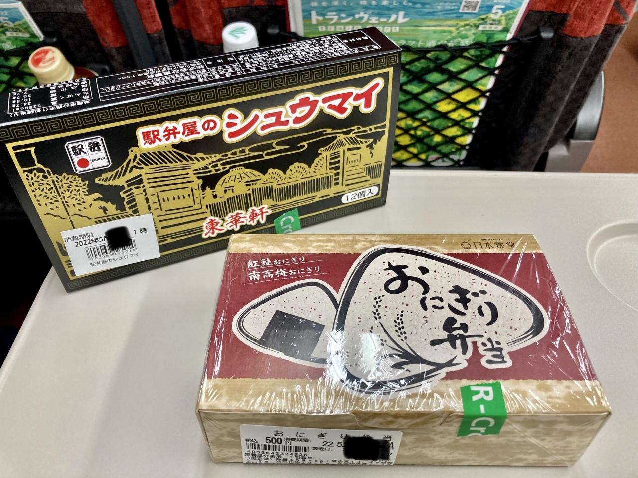 車内で食べ易い一口サイズの天むすを探しましたが、この時間帯は置いてありませんでした。しょうがないので普通のおにぎり弁当を購入。これだけではちょっと寂しいかな?と思いシュウマイも購入。はっきり言ってどちらもハズレでした。特に焼売は小麦粉を食べているような食感でした。