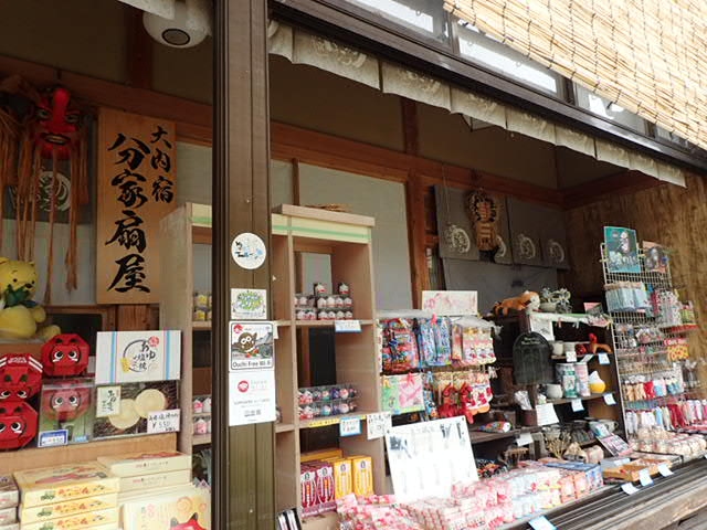 大内宿のメインストリート?の左側、入り口に近い方にありました。お土産物屋さんで、お菓子や漬物、加工品、おもちゃなどわりと幅広い感じでした。店頭にTV番組「充電させてもらえませんか!?」の色紙がありました。