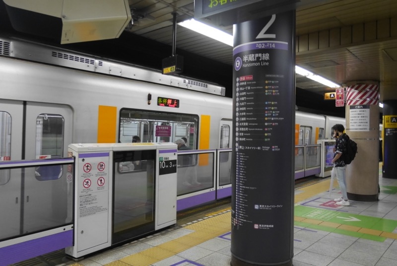 東京メトロの路線のひとつです。紫のライン&半蔵門という渋い名前が江戸感があってよい。渋谷から三越前への移動で利用しました。おそらくビジネスマンの利用のほうが多いのでは?という路線なので、この日は祝日だったため、比較的空いててよかったです。